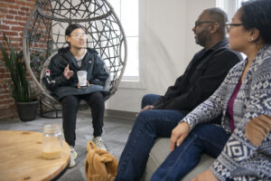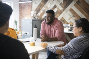 Pictured above: Tim (third from left) sits with community members during a SOFSA coffee hour at GereBlock, a co-working space in downtown Syracuse. | Photo by: Ben Cleeton
