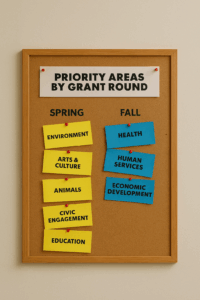 ج: ستعطي جولة الربيع الأولوية للفنون والثقافة والبيئة والحيوانات والمشاركة المدنية والتعليم. وستعطي جولة الخريف الأولوية للصحة والخدمات الإنسانية والتنمية الاقتصادية.