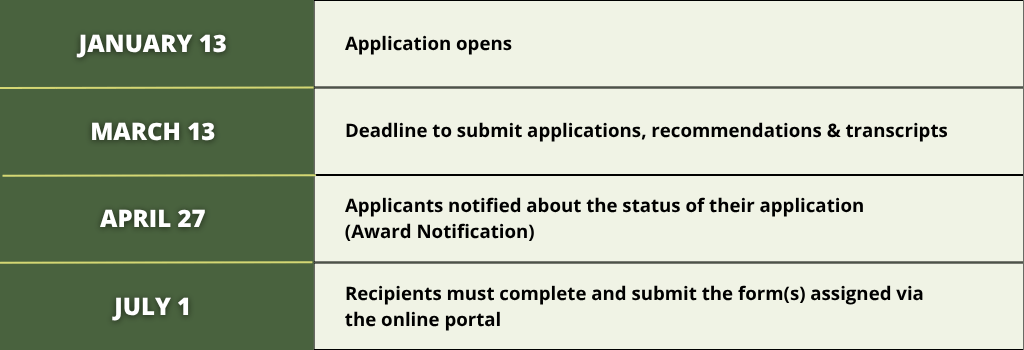 See the chart at the top of this page for the scholarship deadlines and specific dates.