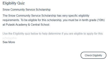 - Find the Eligibility Quiz for the Snow Community Service Scholarship and click the Check Eligibility